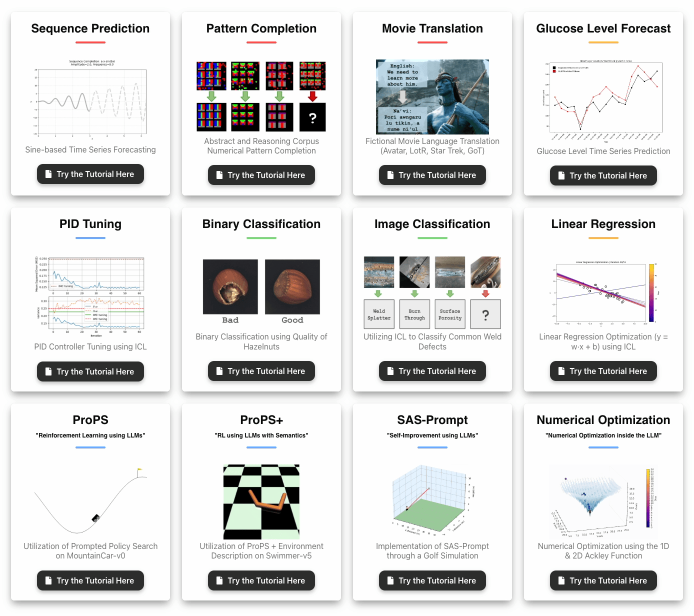 In-Context Learning (ICL) is a machine learning framework where Large Language Models (LLMs) learn new tasks directly from examples and instructions provided in the prompt—without retraining or updating model weights. By interpreting these examples and instructions, the model identifies patterns and applies them to new inputs, enabling flexible, task-agnostic behavior across classification, translation, regression, reasoning, and more. This website introduces the fundamentals of ICL and offers hands-on Google Colab tutorials that showcase its use in regression, reinforcement learning, pattern recognition, and translation.